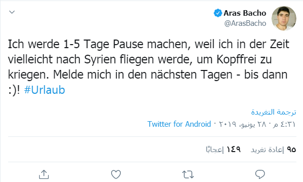 فقبل تغريدة اللاجئ داود نبيل بعشرة أيام، كتب لاجئ آخر عن نيته زيارة بلده ونشر اللاجئ السوري آراس باجو المقيم في مدينة كولونيا تغريدة على تويتر قال فيها: “سآخذ إجازة من يوم إلى خمسة أيام، قد أسافر خلالها إلى سوريا لكي أريح رأسي“، ليجيب عليه المكتب الاتحادي للهجرة واللاجئين بنفس الجواب السابق.