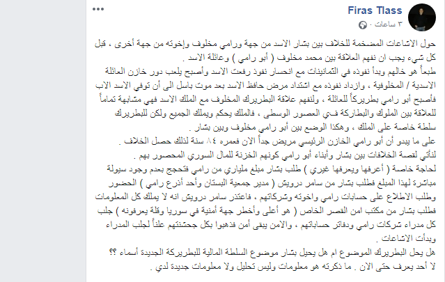 كتب فراس طلاس نجل وزير الدفاع السوري السابق مصطفى طلاس، على صفحته في موقع فيسبوك، ما قال إنها معلومات “حول الاشاعات المضخمة للخلاف بين بشار الأسد من جهة ورامي مخلوف وإخوته من جهة أخرى”.