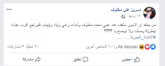 في هذا السياق كتبت نسرين علي مخلوف على صفحتها كلمات موجزة لكنها تؤكد الحالة قالت فيها “من يعتقد أن الأمور عند عمي محمد مخلوف وأبناءه رامي وإياد وإيهاب فليراجع أقرب عيادة بيطرية”، ولا تعلم هاسبيديا درجة القرابة بدقة بين صاحبة المنشور وبين محمد مخلوف.