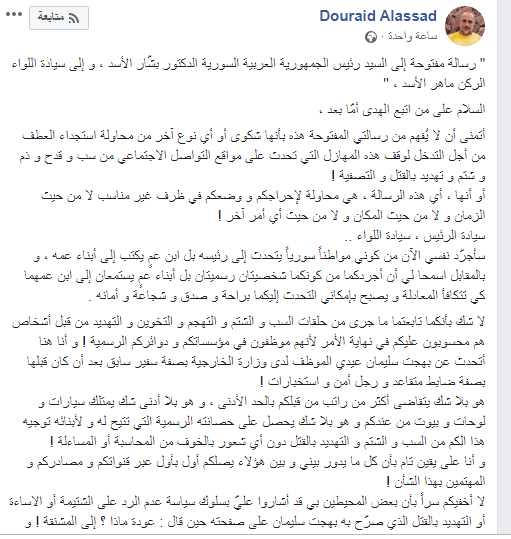 سأجرّد نفسي الآن من كوني مواطناً سورياً يتحدث إلى رئيسه بل ابن عمٍ يكتب إلى أبناء عمه ، و بالمقابل اسمحا لي أن أجردكما من كونكما شخصيتان رسميتان بل أبناء عمٍ يستمعان إلى ابن عمهما كي تتكافأ المعادلة و يصبح بإمكاني التحدث إليكما براحة و صدق و شجاعة و أمانه .