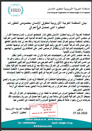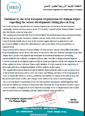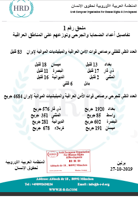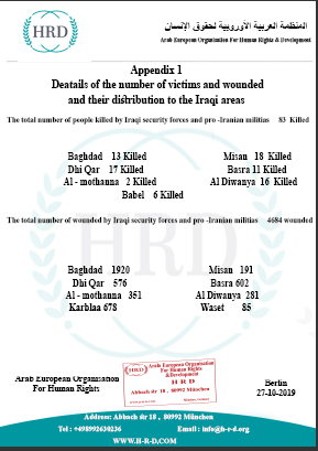 قالت المنظمة التي تتخذ من برلين مقراً لها إن عناصر الأمن العراقي والمیلیشیات الموالیة لإیران قد نفذوا تلك التھدیدات وقاموا بقتل المتظاھرین العراقیین عمدا في شوارع الدیوانیة وواسط والبصرة وذي قار وبابل وغیرھا من المدن العراقیة وتم توثیق 83 قتیل وآلاف الجرحى من المتظاھرین.