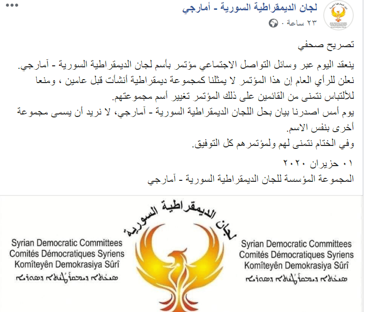 يوم أمس اصدرنا بيان بحل اللجان الديمقراطية السورية – آمارجي، لا نريد أن يسمى مجموعة أخرى بنفس الاسم.
