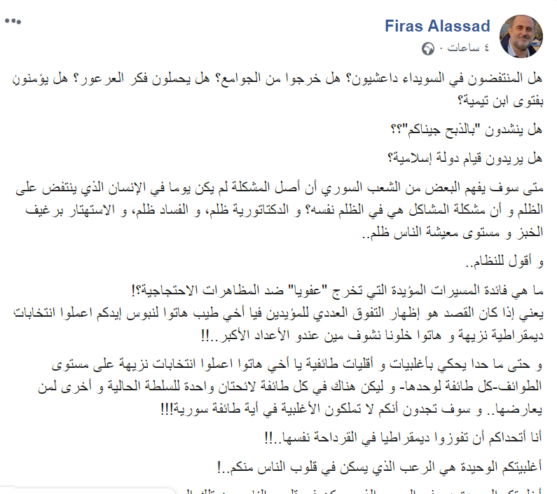 كتب فراس الأسد على صفحته في فيسبوك موجهاً كلامه إلى نظام بشار الأسد بعد مظاهرات السويداء وقال: