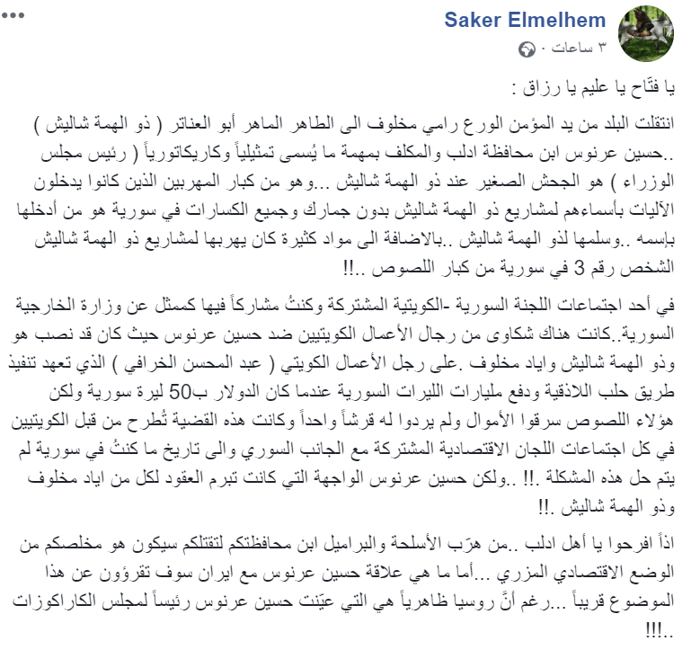 انتقلت البلد من يد المؤمن الورع رامي مخلوف الى الطاهر الماهر أبو العناتر ( ذو الهمة شاليش ) ..حسين عرنوس ابن محافظة ادلب والمكلف بمهمة ما يُسمى تمثيلياً وكاريكاتورياً ( رئيس مجلس الوزراء ) هو الجحش الصغير عند ذو الهمة شاليش …وهو من كبار المهربين الذين كانوا يدخلون الآليات بأسماءهم لمشاريع ذو الهمة شاليش بدون جمارك وجميع الكسارات في سورية هو من أدخلها بإسمه ..وسلمها لذو الهمة شاليش ..بالاضافة الى مواد كثيرة كان يهربها لمشاريع ذو الهمة شاليش الشخص رقم 3 في سورية من كبار اللصوص ..!!