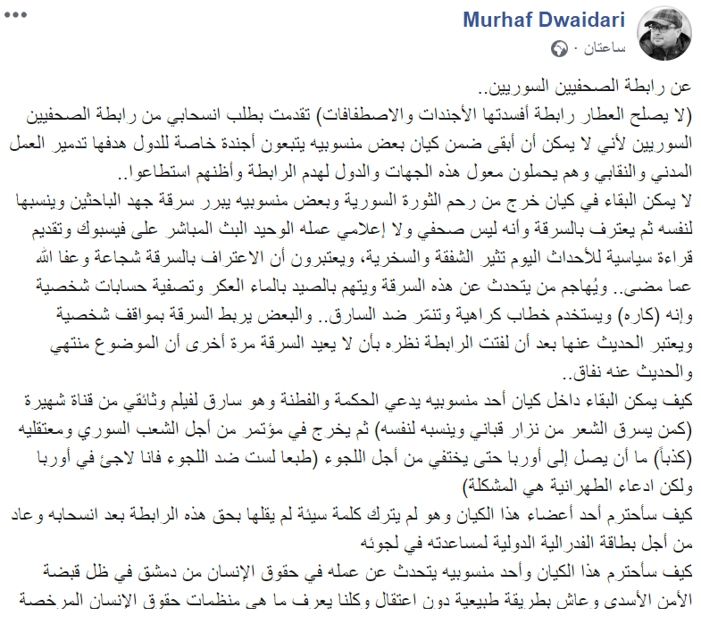 (لا يصلح العطار رابطة أفسدتها الأجندات والاصطفافات) تقدمت بطلب انسحابي من رابطة الصحفيين السوريين لأني لا يمكن أن أبقى ضمن كيان بعض منسوبيه يتبعون أجندة خاصة للدول هدفها تدمير العمل المدني والنقابي وهم يحملون معول هذه الجهات والدول لهدم الرابطة وأظنهم استطاعوا..