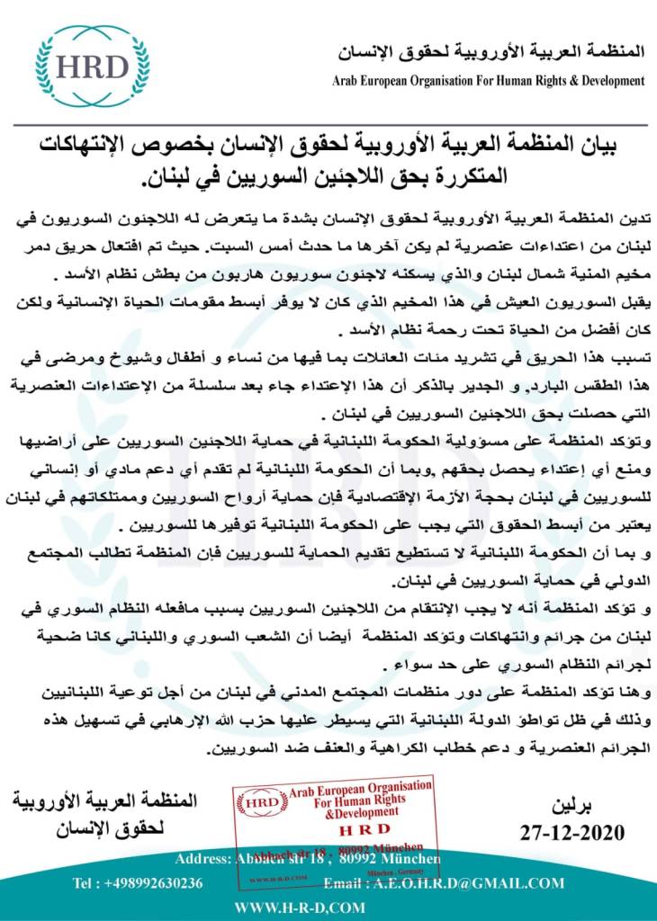 أصدرت المنظمة العربية الأوروبية لحقوق الإنسان بيانا بخصوص الإنتهاكات المتكررة بحق اللاجئين السوريين في لبنان . أدانت فيه الممارسات العنصرية بحق اللاجئين السوريين وقالت فيه:
