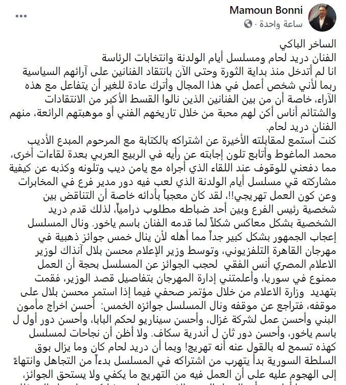 كتب المخرج السوري مأمون البني منشوراً طويلاً على صفحته في فيسبوك حول المقابلة التلفزيونية التي أجراها الممثل السوري دريد لحام المؤيد لجرائم بشار الأسد، تناول فيه البني بعض ما قاله لحام حيث عنون منشوره بـ:
