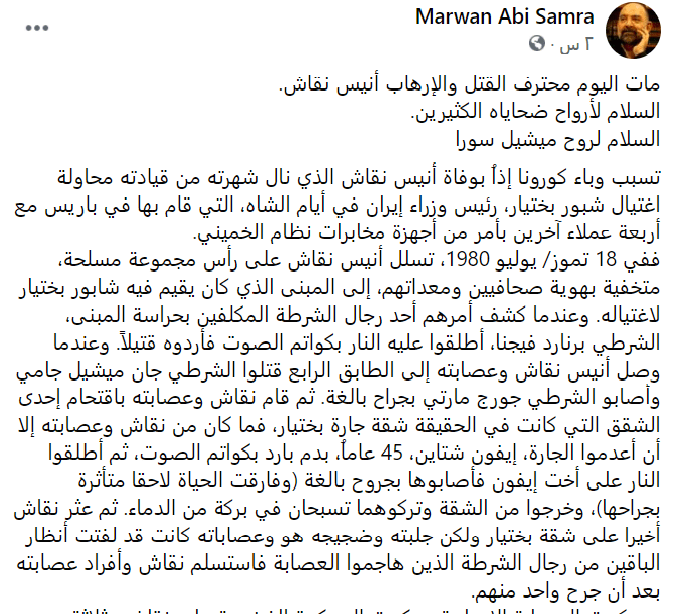 كتب مروان أبي سمرا مات اليوم محترف القتل والإرهاب أنيس نقاش.