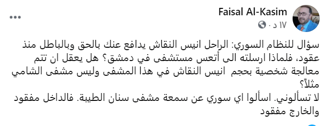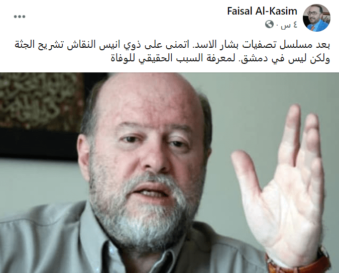 من جهته الإعلامي فيصل القاسم شكك بأسباب موته بكورونا وذلك بعدة منشورات على صفحته في فيسبوك وعدة تغريدات على تويتر وخاصة أنه لا توجد ظروف طبية جيدة بدمشق ليتعالج بها، وطالب من ذويه أن يعملوا على تشريح الجثة لتبيان سبب موته الحقيقي