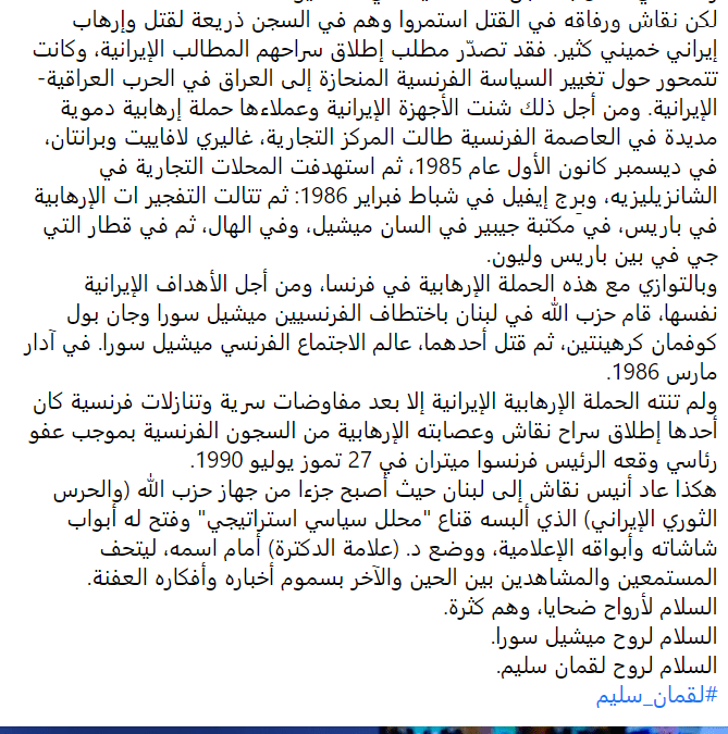 وبالتوازي مع هذه الحملة الإرهابية في فرنسا، ومن أجل الأهداف الإيرانية نفسها، قام حزب الله في لبنان باختطاف الفرنسيين ميشيل سورا وجان بول كوفمان كرهينتين، ثم قتل أحدهما، عالم الاجتماع الفرنسي ميشيل سورا. في آدار مارس 1986.
