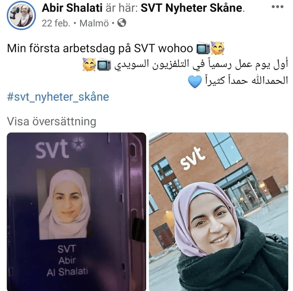 وتعمل عبير شلاتي 26 عاما في التلفزيون السويدي SVT، بحسب موقع Samhällsnytt، الذي قال إنها زارت سوريا، بجوازها السويدي، عام 2019، كاشفا رفضها الإدلاء بتصريح، بالإضافة لحذف صور الزيارة من صفحتها “الفيسبوك”.